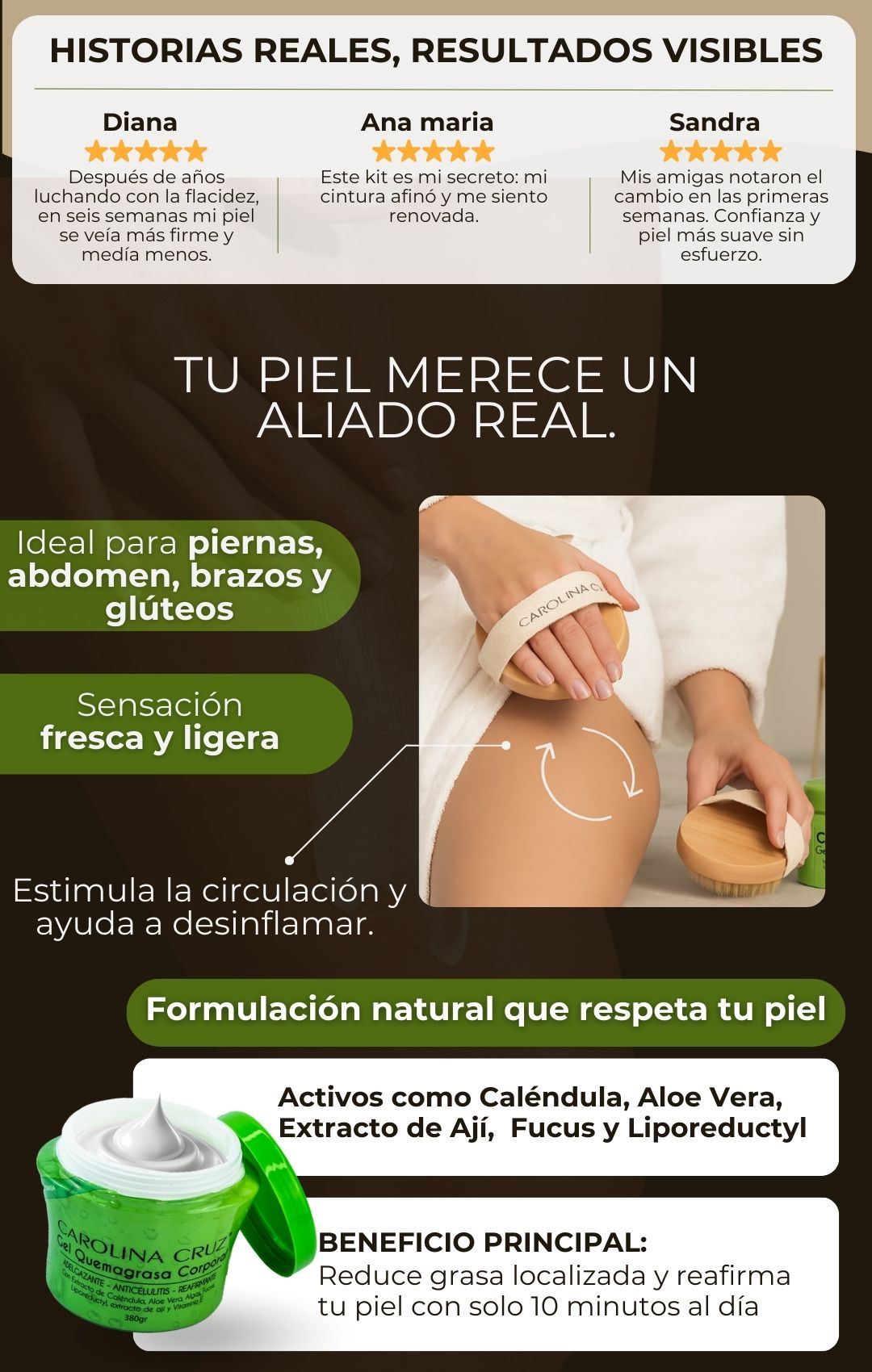 Sí, el kit está diseñado para un uso diario seguro. Se recomienda aplicar el gel y usar el cepillo masajeador con movimientos ascendentes y circulares para obtener los mejores resultados.